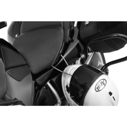 A secure yet easy-to-use handy helmet lock for the R 1250 RT. The steel cord attaches beneath the rider seat and is also secured with a spring-supported bar. The loops are pressed extremely sturdily and also reinforced with a steel thimble. This means it is impossible to open the loops without pulling up the seat.