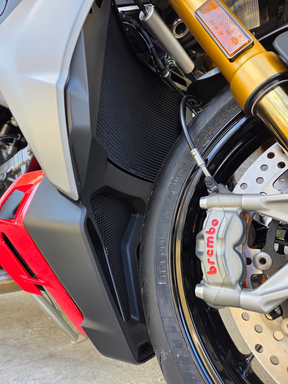- BRAKES — The Panigale V2 models are equipped with Brembo M50 callipers, which ensure outstanding performance on track and excellent controllability on the road. The master cylinder is radial while the brake discs measure 320 mm at the front and 245 mm at the rear. The coloured calipers, available as an accessory, add another personalized touch to the aesthetic.
