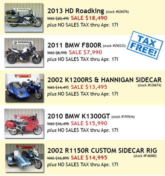 Today is your LAST CHANCE to visit Bob’s or call and shop TAX FREE on parts, accessories, apparel, and even select motorcycles! We’ve even added TWO SIDECARS to the list of TAX FREE eligible bikes! See below.