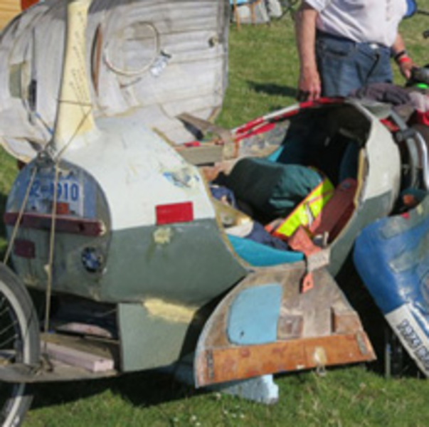The “Cycle-Pod” will have been ridden some 3,000 plus miles from its current home, Chilliwack, BC, Canada before it arrives at Bob’s Oktoberfest on September 21 where it will be retiring into Bob’s personal museum collection; this is the “bucket list” wish of the owner. He’s not ridden through 5 states on the eastern part of the US but has covered all the others including Alaska plus all of Canada on this amusing yet amazing machine. It appears to be amazingly functional right down to the sleeping quarters he pulls. Whether he and the machine have been to Mexico is unknown, but we will be sure to find out when he arrives on September 21.