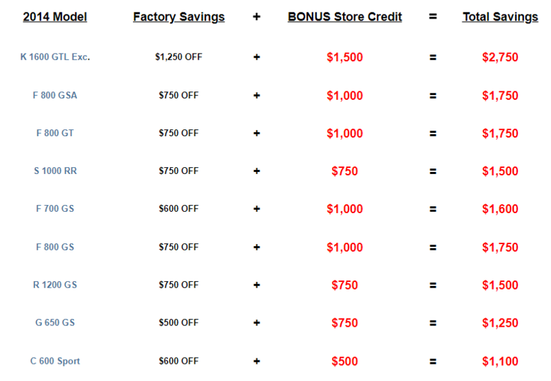 *If the option is taken to apply shopping spree dollars off the motorcycle purchase, customer will receive 80% of original store credit offer. Offer begins January 30, 2015 and ends Friday, February 13, 2015. Prior sales, deposit on existing orders, or motorcycles ordered and/or in transit for a prior order do not qualify. Payment in full or execution of BMWFS loan contract must be completed by February 13, 2015. Shopping Spree promotion cannot be redeemed as cash or combined with other Bob's BMW programs or incentives. Factory to dealer incentives up to $800 off cannot be combined with any Special Sales Programs (Military, Emergency Services, Ride Smart Reward, MSF RiderCoach, etc.) and expires February 13, 2015.