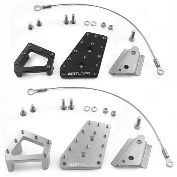 The average person takes 0.5 to 1 full second to react to hazards. Traveling at 60 MPH, a rider will travel 25 to 50 feet before being able to properly react. Most OEM brake pedals have a single-positioned small footprint, yet most ADV riders substantially change foot positioning as they switch between standing and sitting. If your foot is not already situated correctly on the rear brake pedal, you are now potentially doubling reaction time and distance to make what could be a critical stop. This is why you see all motorcycle racers with 1 or 2 fingers on the front brake lever in photographs. AltRider has taken away this additional hazard with the patent pending DualControl Brake System. There are three parts to the AltRider DualControl Brake System that enhance control and reaction time; a riser, an enlarger plate, and a brake snake.