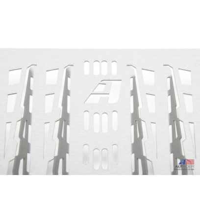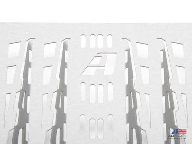 Laser cut 1/16 inch (1.5 mm) aluminum creates a robust, yet lightweight guard that prevents sticks and other debris from puncturing the radiator. After a comprehensive study, the size of each louver is deliberately designed to provide complete protection without restricting necessary airflow. The louvers also provide additional rigidity to the entire piece. The radiator guard is spaced a minimum 1/2 inch (12.7 mm) from the radiator face to further enable airflow. Installation is simple with the provided hardware.