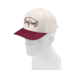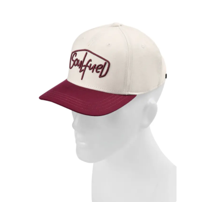 Two-tone cap with large embroidery on the front.