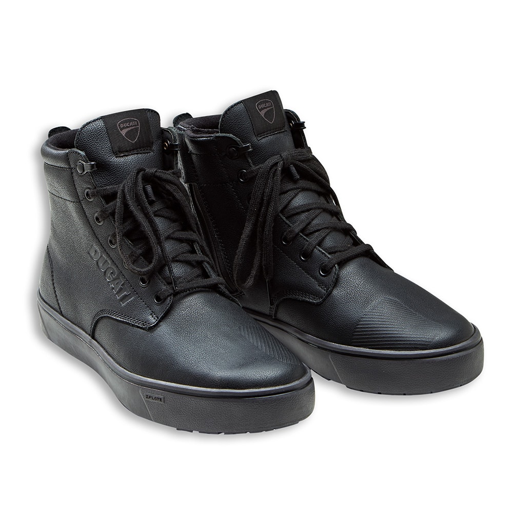 Downtown C2 is a motorcycle sneaker that combines maximum riding and walking comfort with high levels of protection. Totally waterproof thanks to the T-DRY membrane, it has a full grain leather upper that makes it particularly comfortable and a special construction with hexagonal treads that facilitate grip. Reinforcements on the toe and heel and protection on the malleolus with TPU inserts maximize safety, in addition to the outsole made of wear-resistant rubber, which provides stability even on slippery ground. Maximum protection thanks to the special Zplate® insert, made of molded polymer, which combines transverse rigidity and longitudinal flexibility. This allows the shoe to follow all the natural movements of the foot, both when riding and walking, while avoiding crushing in case of impact. An accessory that focuses as much on performance as on its sophisticated and distinctive look, unmistakably Ducati, to fully enjoy all the emotions on two wheels.