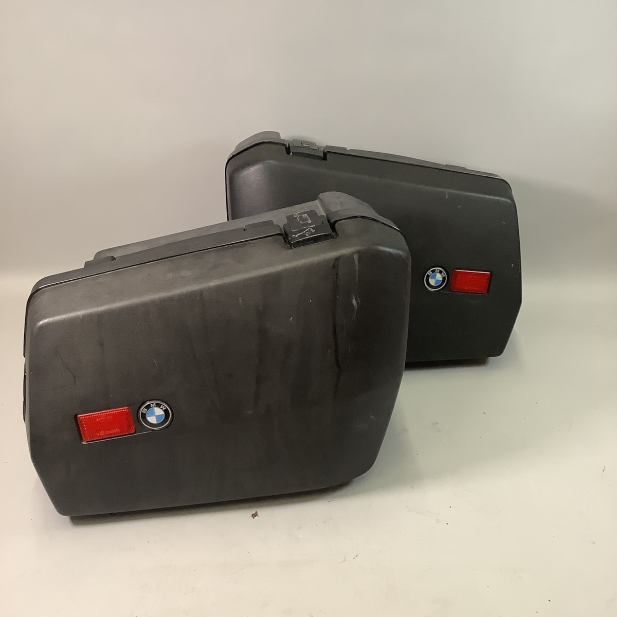 Fairly used set of side cases, the locks and mount locks are all functional, could use a deeper cleaning on the inside, one case has a cracked bottom see pictures.