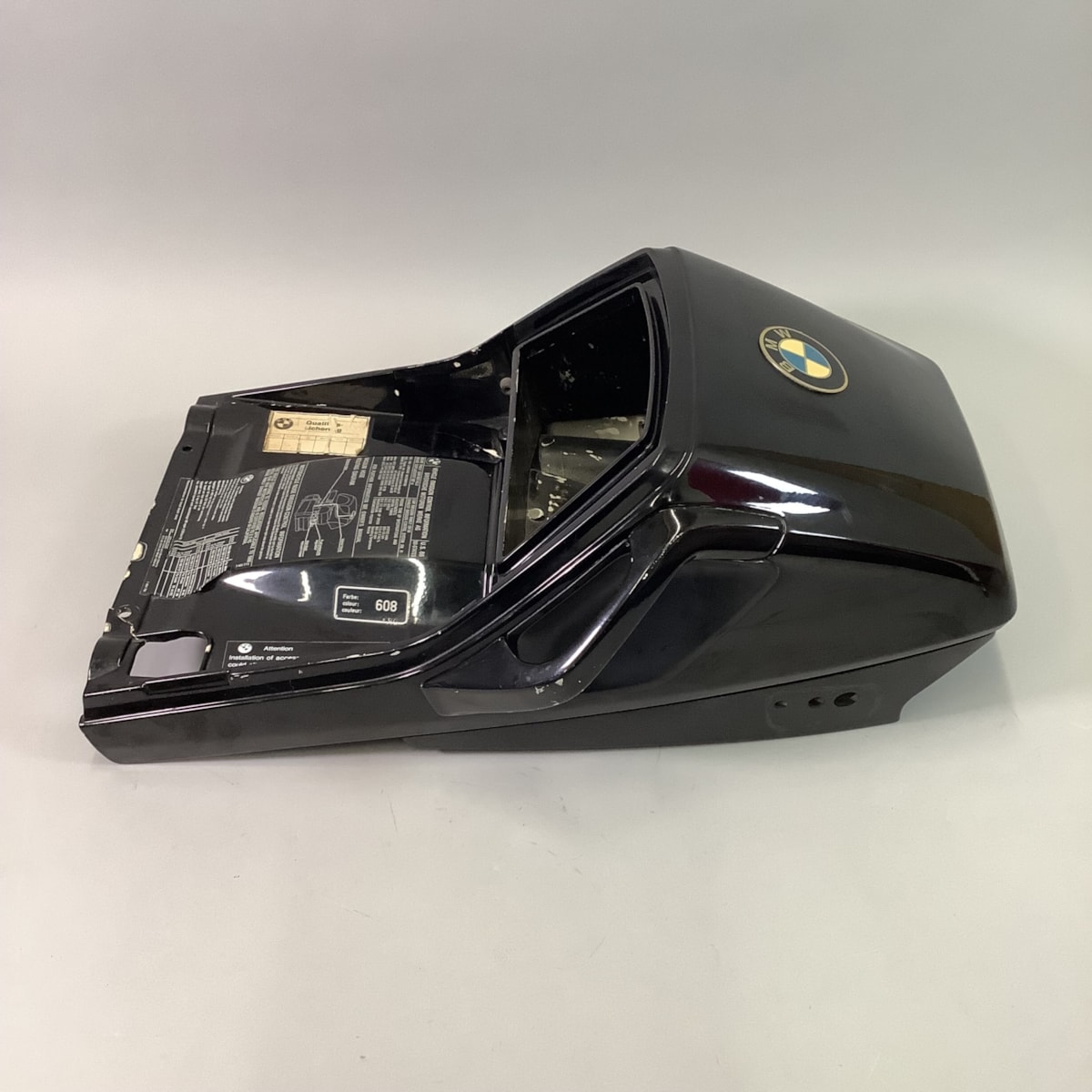 Moderate scratches throughout. Two front bolt holes appear to be cracked. Handles are scuffed and nicked. Yellowing of the roundel. This rear fairing is in okay shape.