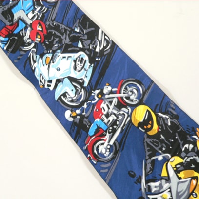 This 100% silk necktie features a motorcycle theme design by famed motorsports illustrator Dennis Simon. Part of a series of four designs commissioned by Bob’s BMW. These beautiful ties are available exclusively from Bob’s!